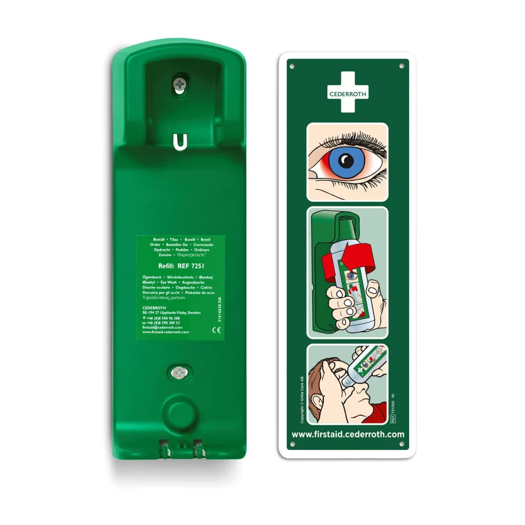 Kemény, zöld műanyagból készült robusztus és praktikus fali tartó Cederroth szemkimosó palakhoz. A fali tartó fix helyet biztosít a flakon számára, így vészhelyzetben könnyen megtalálható. A palack automatikusan kinyílik a tartóból való kicsavaráskor, lehetővé téve az azonnali öblítést. A tartó bármilyen függőleges felületre felszerelhető, pl. falra, járműre, laboratóriumi asztalra vagy akár a Cederroth elsősegélynyújtó táblára is. Fluoreszkáló használati utasítás táblával ellátva.