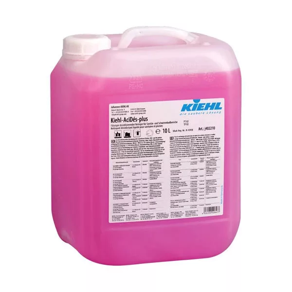 Kiehl-AciDés-plus eltávolítja a vízkő és mész-szappan lerakódásokat. Amennyiben savra érzékeny felületen alkalmazzuk, akkor maradandó sérülések keletkezhetnek a felületen. A gyorsan ható fertőtlenítő tisztítószer már alacsony higításban is kiváló tisztítási eredményt ér el. Hatásos baktériumok-, élesztő-, bőrgomba és szemölcs vírus ellen. VAH és RK listázva.