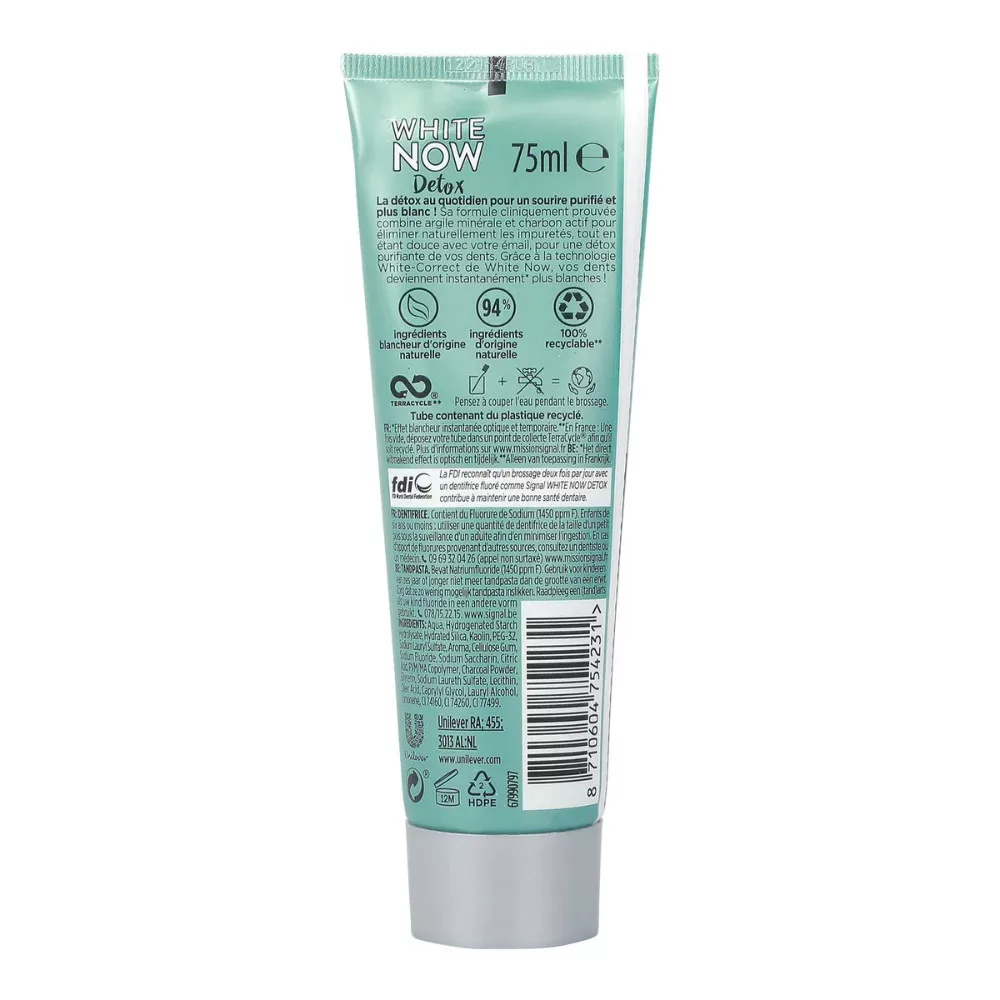 A Signal White Now Detox Mineral Clay & Coconut Extract fogkrém, formulája 94,5%-ban természetes eredetű összetevőket tartalmaz, a benne lévő ásványi agyag és kókusz kivonat erejével segít eltávolítani a szennyeződéseket. A White Now fehérítő technológia akár 3 árnyalattal fehérebb mosolyt biztosít azonnal, miközben gyengéd a fogzománchoz. Hatása klinikailag igazolt. (*Az azonnali fehérítő hatás ideiglenes és optikai. 61 alanyon végzett klinikai vizsgálat alapján, a kiindulási állapothoz képest.) Segít ragyogóvá tenni a mosolyodat és hosszan tartó frissességet biztosítani. A fogkrém tubusát úgy tervezték, hogy újrahasznosítható legyen, újrahasznosított műanyagot tartalmaz és hogy csökkentsék a hulladék kibocsátást, doboz nélkül kapható.