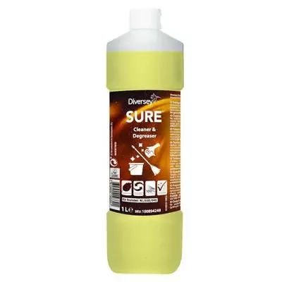 A SURE Cleaner & Degreaser egy általános felülettisztító szer koncentrátum, mely minden konyhai vízál ó felület, többek között falak, ajtók, padlók, mennyezet és berendezési tárgyak tisztítására alkalmas, élelmiszert feldolgozó/felhasználó helyiségekben is.