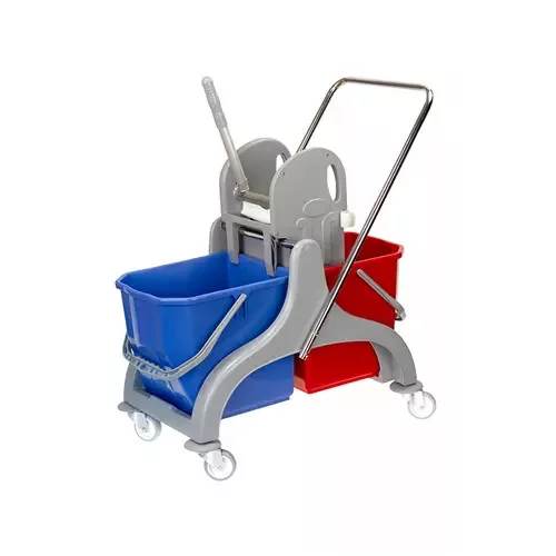 Kétvödrös felmosókocsi, 25 L-es vödrökkel, moppréssel, krómozott fém vázzal, tolókarral, 8 cm átmérőjű kerekekkel.