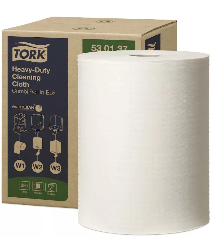 A Tork nagy teljesítményű tisztítókendő nedvszívó képessége igen nagy, a kendő maga pedig vastag és ellenálló: alkalmas az erős dörzsölésre, és közben nem foszlik szét. A legtöbb tisztítószerrel használható. Gyorsan és hatékonyan eltávolítja az olajat, a zsiradékot, a szennyeződéseket és a makacs foltokat, miközben védi a kezet a fémforgácsoktól és a hőtől. A kendő a Tork hordozható vagy falra szerelhető adagolóival használható, amelyek biztonságos és hatékony eszközök. Ezenfelül a Tork Maxi belsőmagos adagolóba vagy a Tork Maxi dobozos kombi tekercses adagolóba is behelyezhető, amivel lehetővé válik az egykezes adagolás.