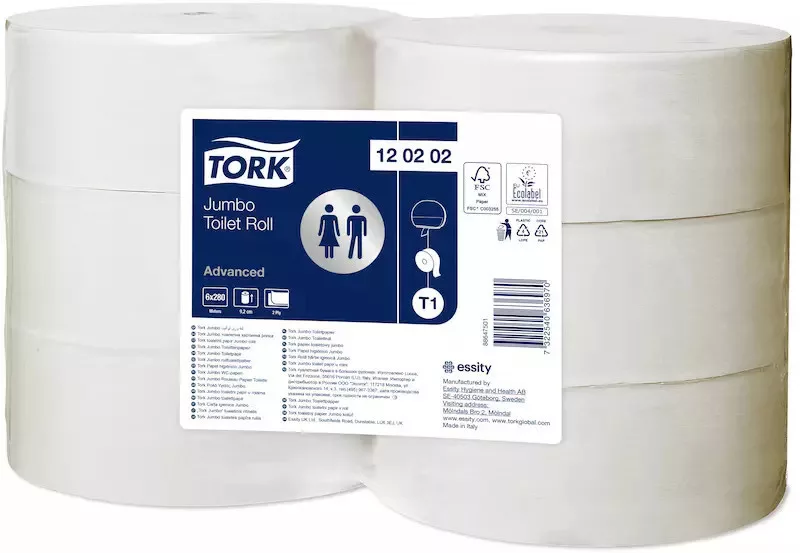 A Tork Jumbo rendszer alapeleme a hatékony időkezelés és a költségcsökkentés: a hagyományos tekercseknél jóval több papírt biztosít. A 2 rétegű Tork Jumbo toalettpapír tökéletes egyensúlyt teremt az ár és a minőség között. Forgalmas helyiségekbe ajánljuk.