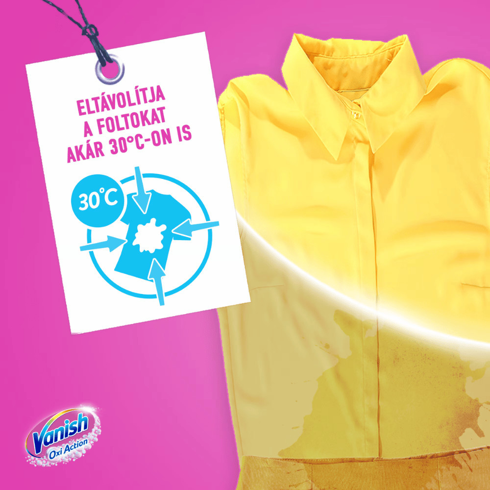A Vanish Oxi Action Color gél hatékonyan távolítja el a makacs foltokat, miközben klórmentes, színvédő formulája megőrzi a ruháid élénk színeit. Már 30°C-on is működik, így energiát takaríthatsz meg minden mosásnál.