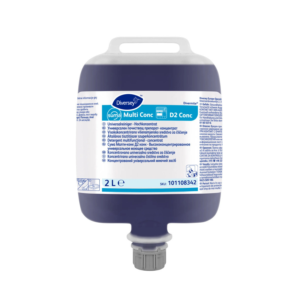 A Suma Multi-conc D2egy erősen koncentrált tisztítószer. Alkalmazható rozsdamentes acél, csempe, gumi, műanyag, porcelán és mosható felületek tisztítására, ill. padlók, falak, berendezések rendszeres lemosására élelmiszerrel érintkező területeken.