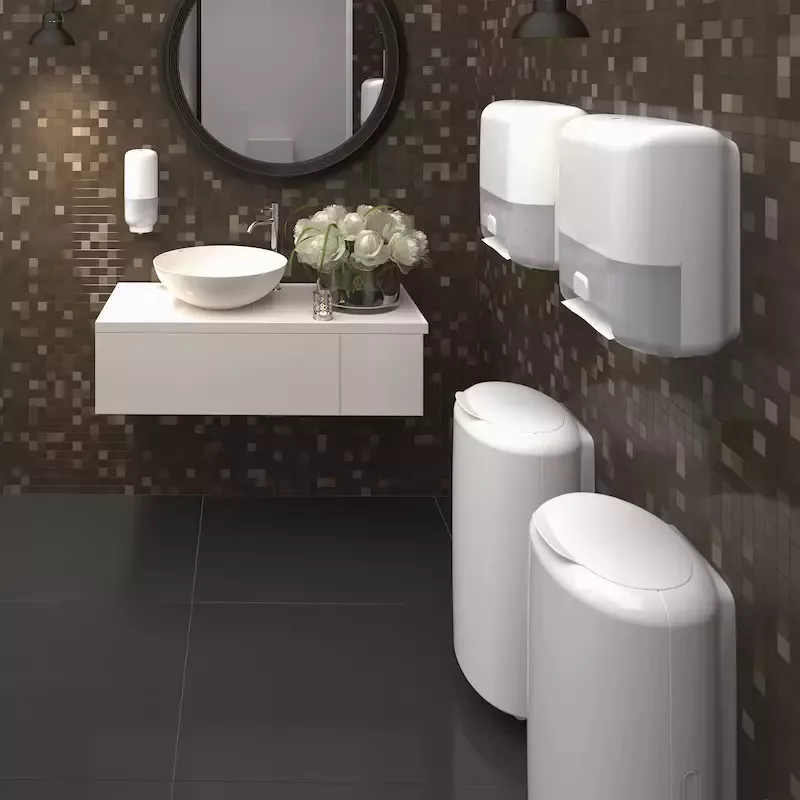 Az Elevation kialakítású Tork 50 literes hulladékgyűjtő kiváló megoldás a legtöbb mosdóba, a rendelkezésre álló helytől és az igényektől függően akár a falra is felszerelhető, vagy a padlóra is helyezhető. A Tork Elevation adagolók jól használható, modern kialakítása mély benyomást tesz a mosdóhasználókra.
